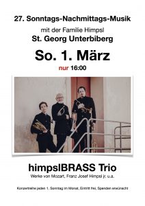 Wir laden herzlich ein zur 27.Sonntags-Nachmittags-Musik mit der Familie Himpsl in St. Georg Unterbiberg am 1. März um 16 Uhr mit dem HimpslBRASS Trio.