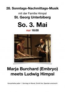 Wir laden herzlich ein zur 28.Sonntags-Nachmittags-Musik mit der Familie Himpsl in St. Georg Unterbiberg am 3. Mai um 16 Uhr mit Marja Burchard meets Ludwig Himpsl.